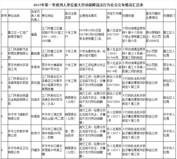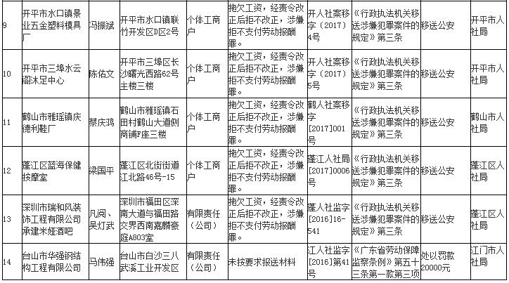 今年第一季度,江门市人力资源社会保障行政部门继续加大对欠薪等重大违法行为的打击力度,各地特别是蓬江区、新会区、开平市等地对欠薪逃匿、欠薪涉及人数和金额巨大等违法行为重拳出击,依法处罚处理,对涉嫌犯罪的坚决移送司法机关绳之以法,切实维护劳动者的劳动报酬等权益。为加强对违法用人单位的社会监督,强化诚信体系建设,加大威慑力,依据《广东省用人单位重大劳动保障违法行为社会公布暂行规定》,现将部分地市查处的一批重大违法案件予以公布。