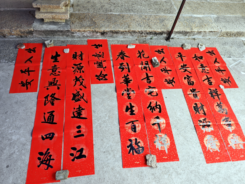 活动现场气氛热烈。现场长桌排开、纸砚铺就,书法家黄卓桓挥毫泼墨写下“国泰民安”“出入平安”“吉祥如意”等四字春联祝福语、“春到华堂生百福,花发吉宅纳千祥”等农历甲辰年对联。他用一幅幅春联祝愿国家繁荣昌盛、山河锦绣,表达着对人们的美好祝愿。