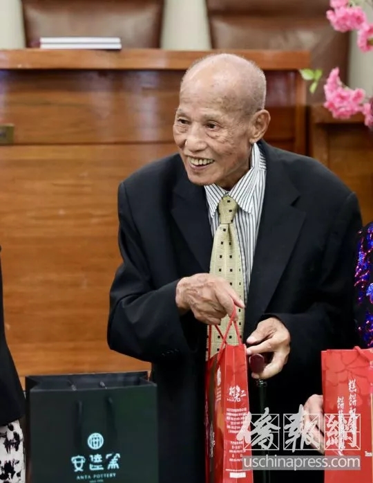 资料图:2015年2月16日,著名侨领黄金泉(左)参加中国驻洛杉矶总领馆举办的传统侨社新春招待会。中新社发 毛建军 摄