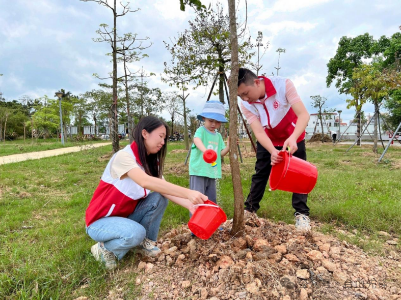 “这棵树苗是我们一家认领的,日常下班后我就来看看,给它浇浇水。三分栽种,七分养护,推动绿化长效管护,需要广大群众参与其中。”为了让孩子提高责任感,增加对绿美生态的认识,白沙镇机关第一党支部书记、农业农村办公室副主任翁嘉欣带头主动参与党支部的主题活动,一家认领了白沙公园内的一棵“家属苗”,其家庭曾获得台山市先进家庭(亲子、情侣)义工称号。目前,像翁嘉欣这样认领属于自己“家属苗”的家庭已有50多户,负责联系的工作人员会定期通过微信群指导他们落实日常养护。