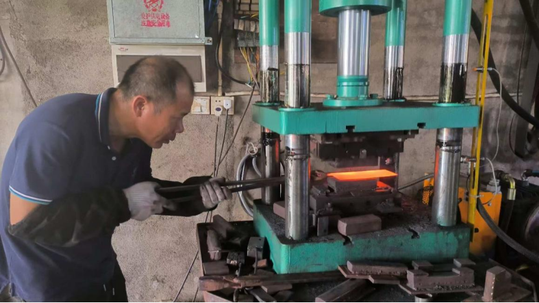▲黄伟文在使用锻压机对刀具进行塑性变形