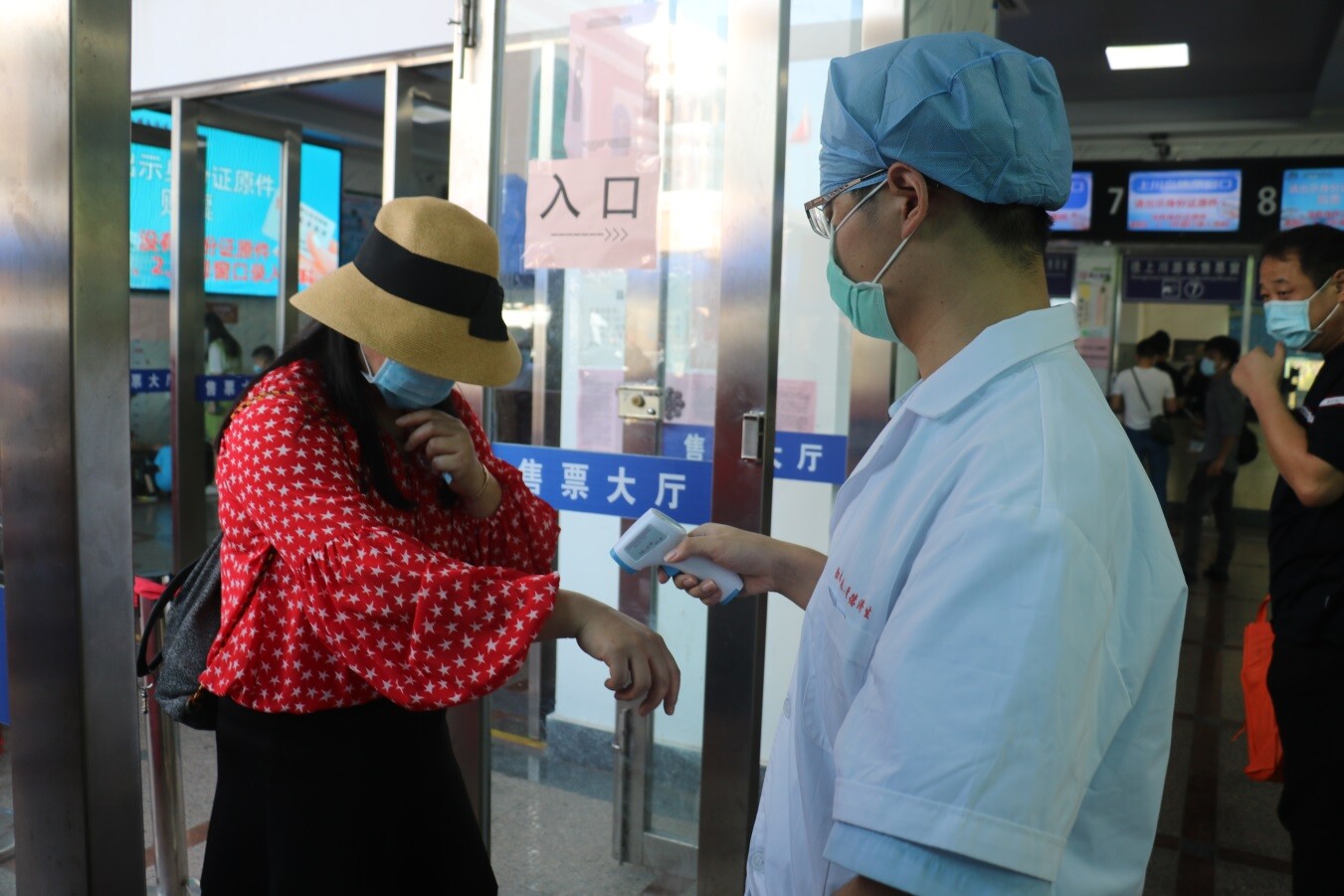 在售票大厅,志愿者配合医护、安保人员做好游客疏导工作,引导游客接受体温检测,防止厅内人员大面积聚集,管控售票大厅内排队游客人数。