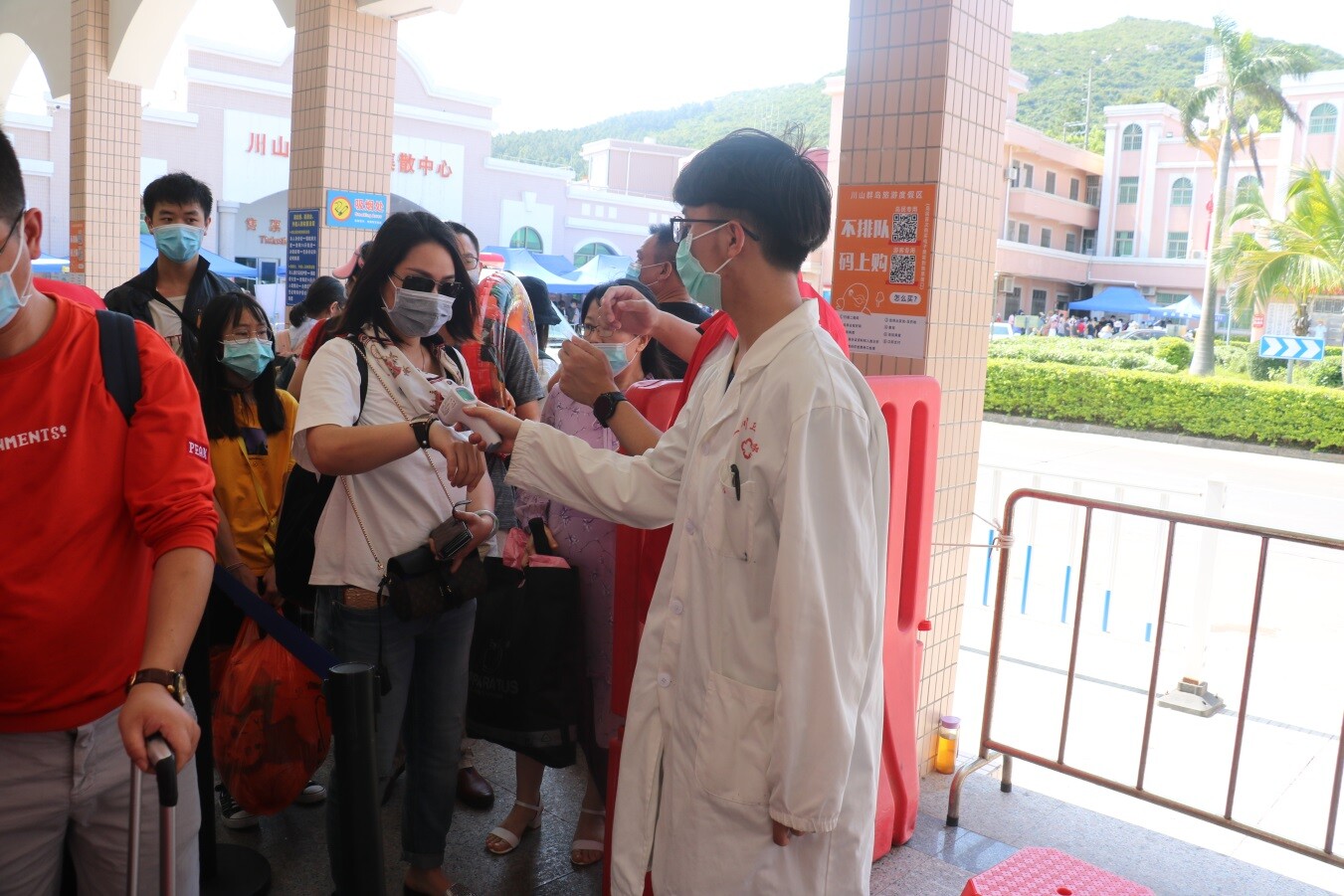 在候船厅外,志愿者做好游客限流、疏导,避免人员在候船厅内外逗留、聚集,引导过岛游客配合体温二次检测……