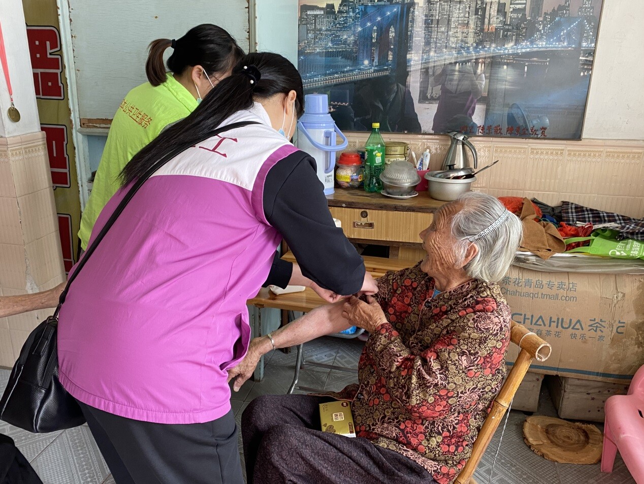 志愿者和义工入户为老奶奶们送上节日慰问和祝福,医护志愿者为她们测量血压,提供健康指导。其中,98岁的曹奶奶收到志愿者和义工的慰问,开心地说道:“新时代真好,有你们真好,每逢节日都能感受到国家的关怀,谢谢你们!”