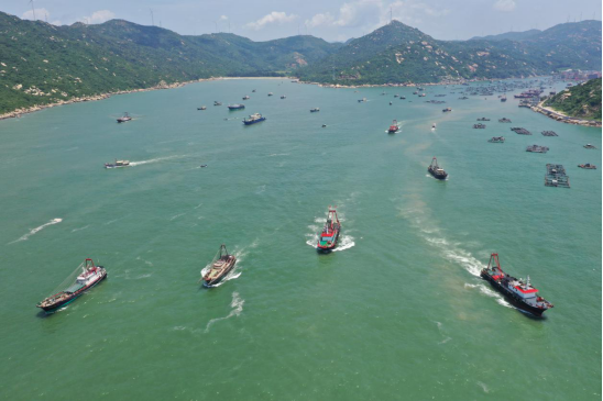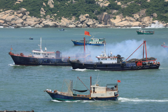 正午12时,随着连绵不断的鞭炮声,在上川岛沙堤渔港整装待发的渔船扬帆起航,开渔了!