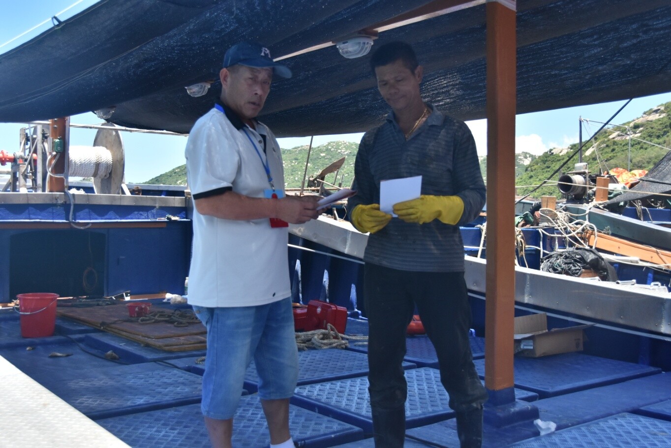 沙堤渔业村海上人大代表联络站驻站代表上渔船宣传海洋环境保护知识