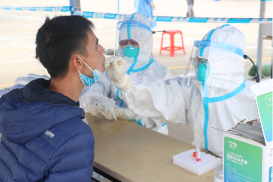 现场设置测温区、等候区、登记区、采样区以及多条检测通道。采样全程严格按照10人一组、保持1米间距、佩戴口罩等要求,分批次有序进行。