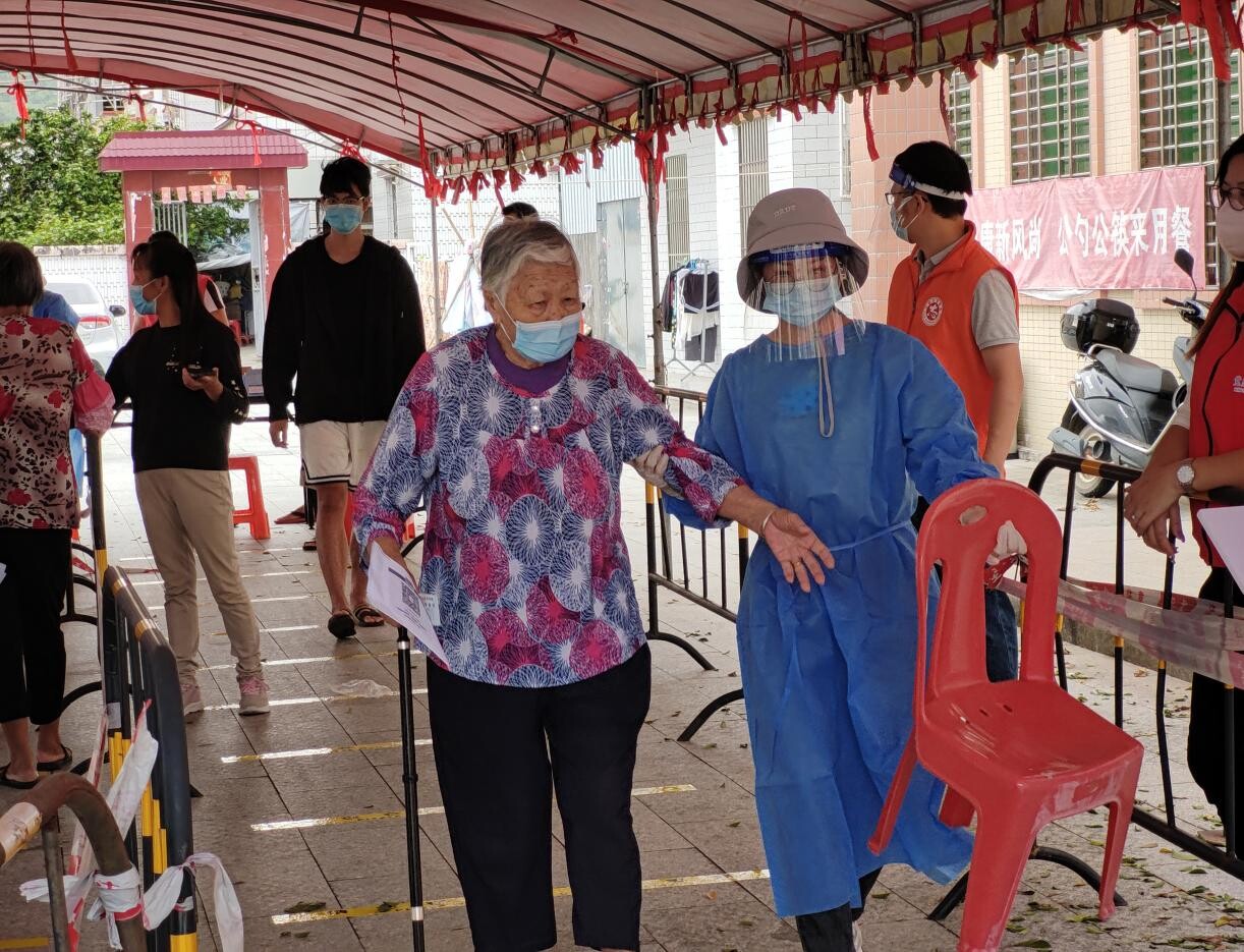 护岭村委会采样点设置了党员先锋岗,为前来采样的群众当好“服务员”,现场还为行动不便的群众提供座椅并开通绿色通道,努力让每一位群众感受到关怀暖意。