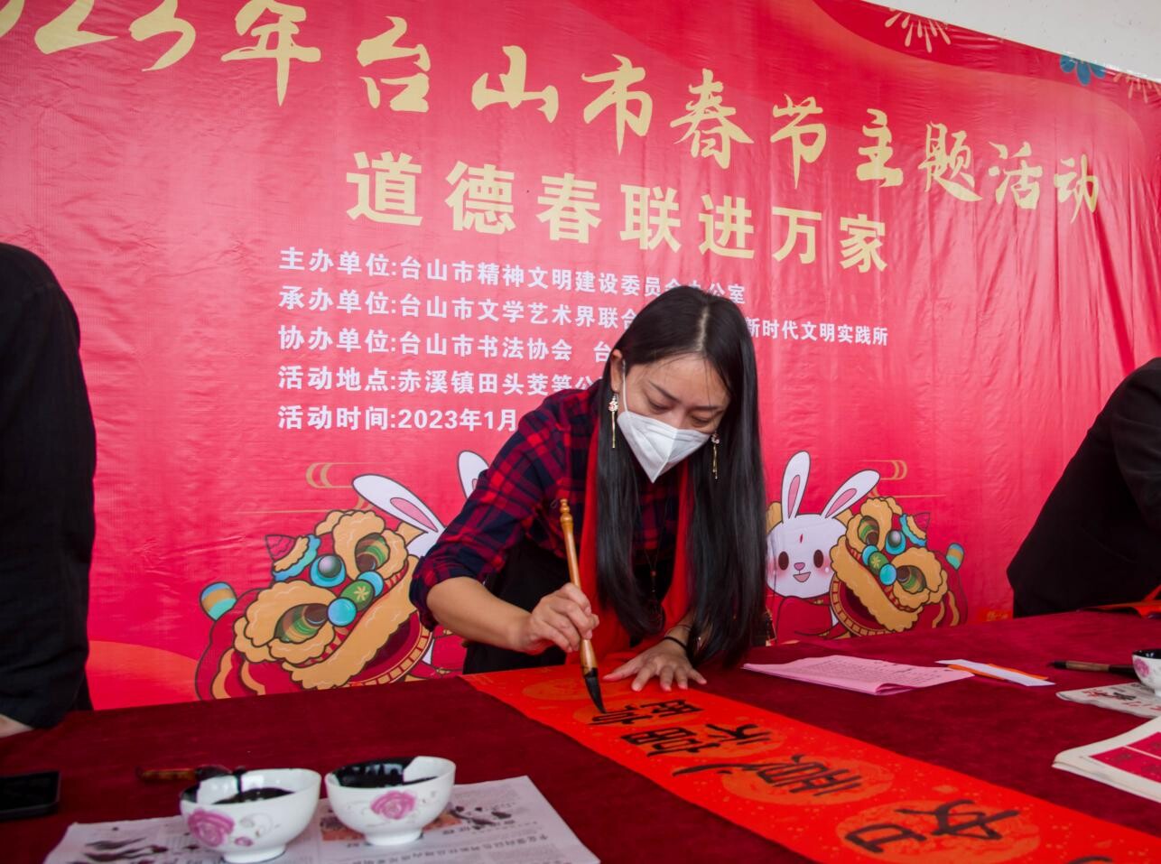 新春佳节来临之际,神州大地普天同庆,共迎癸卯兔年。赤溪镇新时代文明实践所、站组织开展了丰富多彩的文化活动,特邀请来自台山市书法协会和美术协会的6位书法家参加“道德春联进万家”活动,为群众送去新春文化盛宴,100多副苍劲有力、对仗工整、寓意吉祥的春联和一张张饱满的“福”字把浓浓的年味、深深的祝福送到百姓身边。