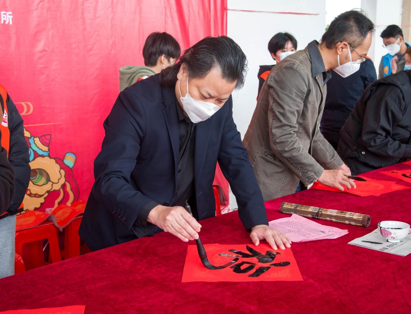 活动现场,数张方桌一字排开,工作人员准备好墨汁、毛笔,将各种尺寸的撒金纸铺放在桌上,6位书法家挥毫泼墨、笔走龙蛇,多种书体各显神韵,他们认真地压纸、沾墨、起笔、收笔,一副副饱含温馨祝福的春联和福字跃然纸上,“平安二字值千金,和顺满门添百福”“春归大地人间暖,福降神州喜临门”......诚挚的祝福洋溢在字里行间,为即将到来的兔年春节增添了喜庆的氛围。