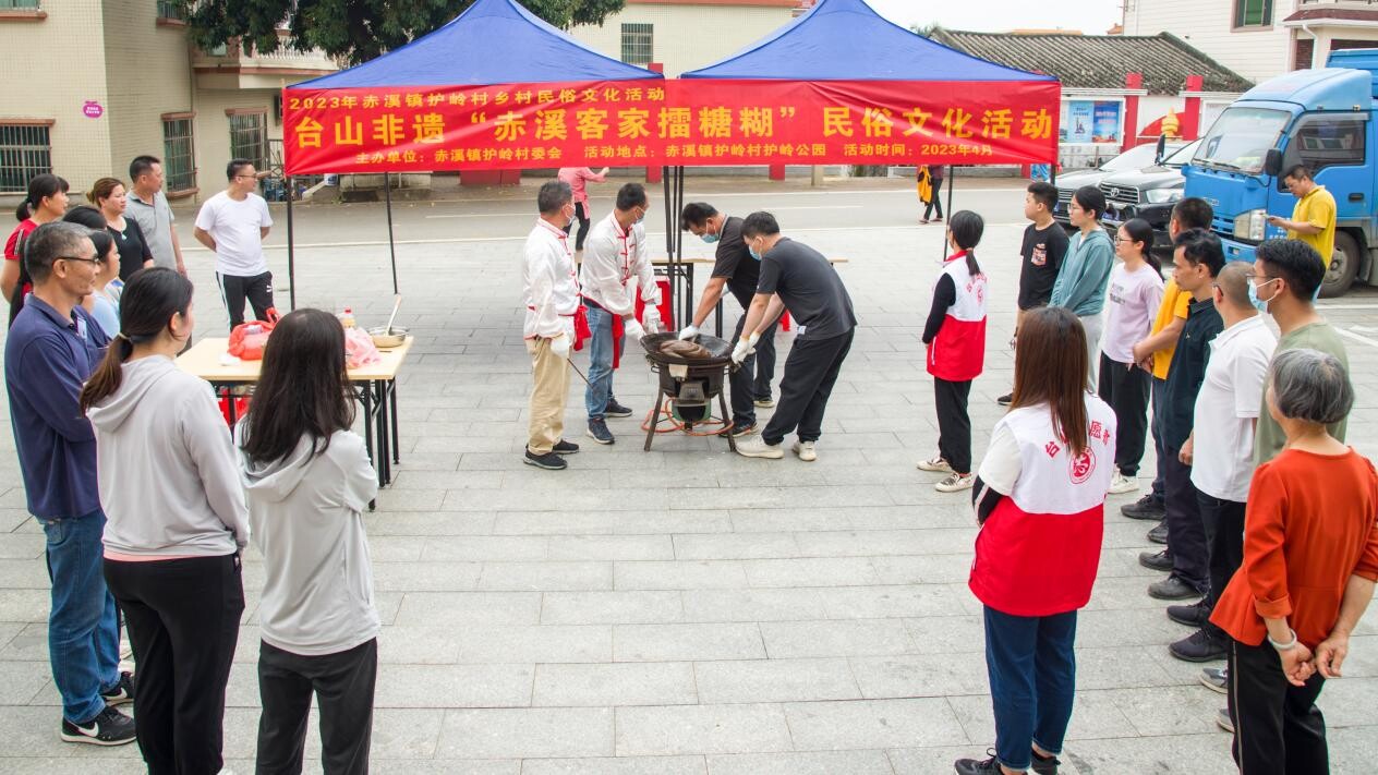 4月15日,赤溪镇护岭村举办台山非遗“赤溪客家擂糖糊”乡村民俗文化活动,邀请客家擂糖糊非遗传承人刘耿维师傅现场制作擂糖糊。