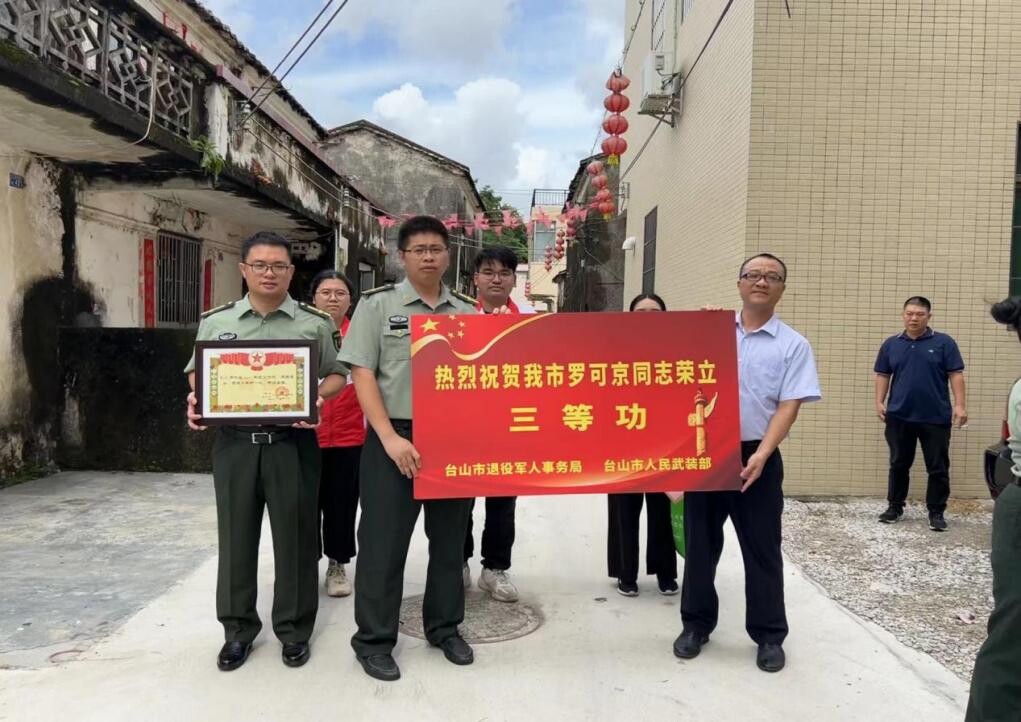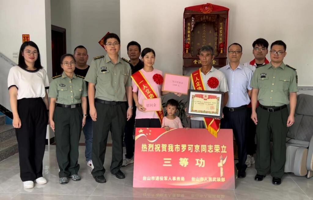 近日市退役军人事务局、市人民武装部、赤溪镇人民武装部和赤溪镇冲金村民委员会一行为荣立“三等功”的现役军人罗可京家庭上门送立功喜报奖励金为其家属披上光荣绶带分享喜悦,传递尊崇,营造“一人立功、全家光荣”的喜庆氛围。