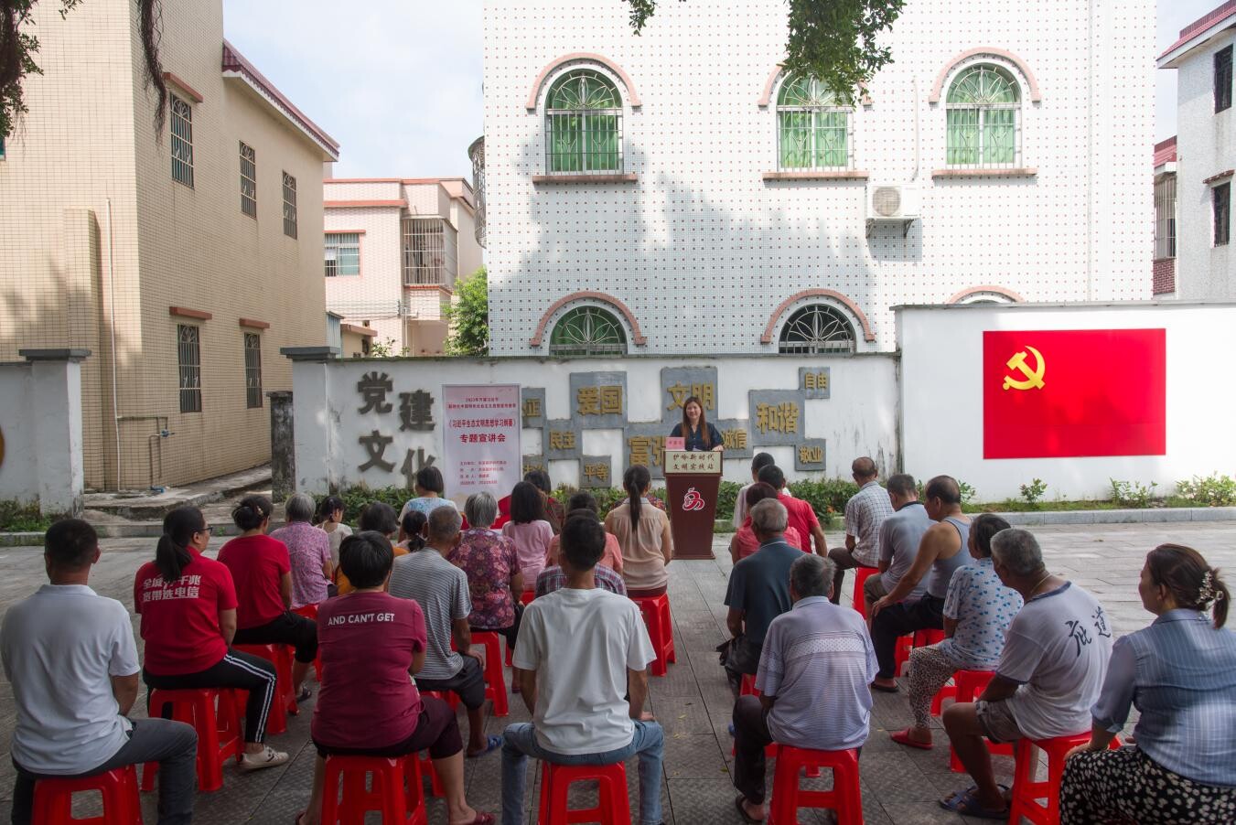 近日,在护岭公园的党建文化墙前,开展了一场以习近平新时代中国特色社会主义思想为主题的宣传教育活动。护岭村党总支副书记黄建英作为宣讲员,向村委会干部及群众进行了《习近平生态文明思想学习纲要》的专题宣讲。