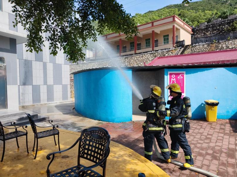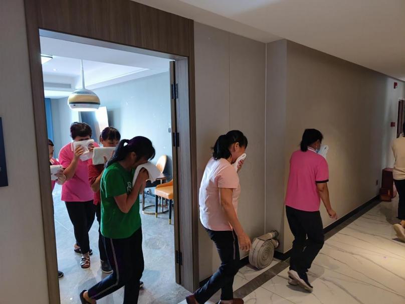 此次演练模拟了海角城酒店突发火情的情景。“智慧消防”系统第一时间监测到火警,海角城的工作人员在确认火情后报警,组织客人进行有序疏散。酒店微型消防站工作人员携带灭火器对初期火灾实施扑救。接到报警电话后,赤溪镇专职消防队立即前往现场进行专业处置。