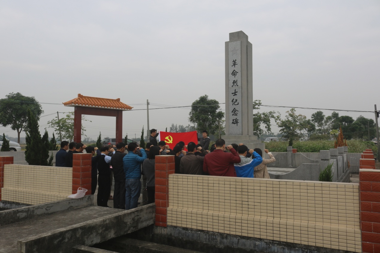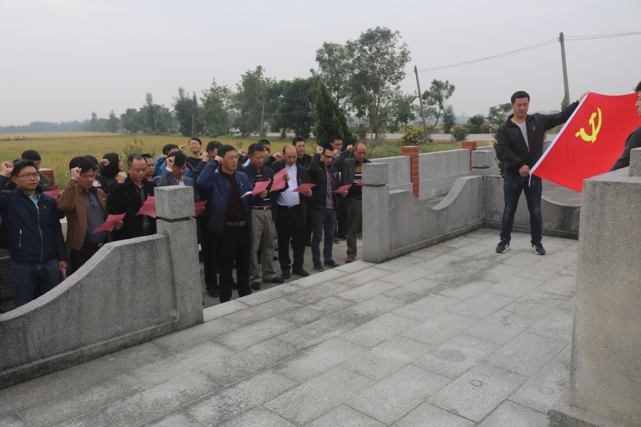 在革命烈士纪念碑前,在方健康书记的带领下,在场每位党员肃穆凝立,首先为革命烈士默哀1分钟,然后在方健康书记的领誓下,每位党员面对鲜红的党旗,高举右拳,重温了入党时的铮铮誓言。