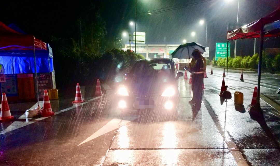 ▲深夜冷雨中坚守高速路口防疫检查站的工作人员
