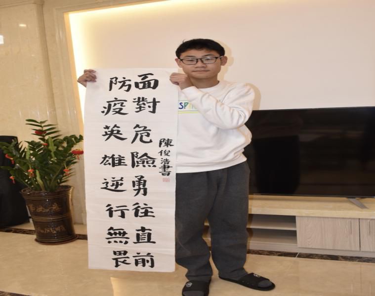 一位小同学委托父亲向一线工作人员送上“面对危险勇往直前,防疫英雄逆行无畏”的毛笔字,为可爱的逆行者点赞鼓舞。