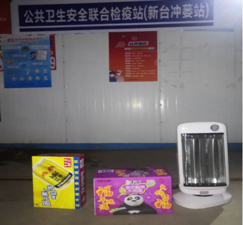 2月17日晚上7点半左右,冲蒌镇高速路口联合检疫站工作人员忙着对来往车辆进行检测。这时,一位热心群众将提神饮料、泡面、暖风机等物品放下就驾车匆匆离开,工作人员甚至都还没来得及说一声感谢。