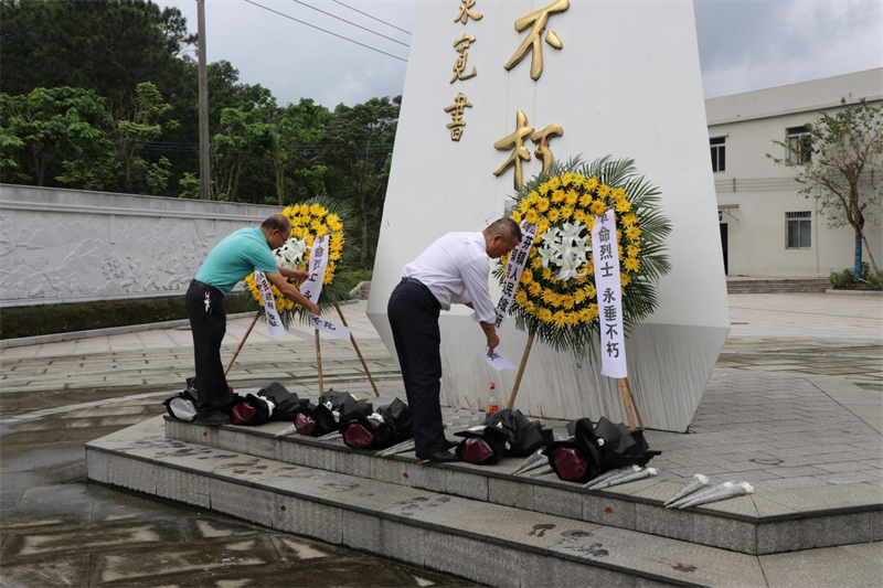 在庄严肃穆的烈士纪念碑前,全体人员整装肃立,向英勇牺牲的烈士默哀。默哀毕,随着《献花曲》响起,少先队员代表和党员代表向革命烈士敬献鲜花,镇领导班子代表上前整理缎带,表达对革命先烈的深切缅怀与崇高敬意。