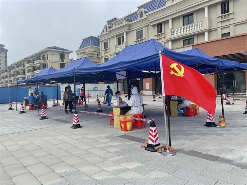 3月22日在9个检测点现场,党旗高高飘扬在抗疫一线,端芬镇政府、村(居)委会干部,党员志愿者组成“铜墙铁壁”的党员先锋队,坚守防疫线,要求前来采样的人员做好扫码、测温工作,切实守好防疫卡口,齐心合力,助力核酸采样。现场志愿者耐心协助采样群众扫码,引导群众有序排队、采样,大家各司其职,一个个忙碌的身影身体力行地诠释了为人民服务的党员精神。