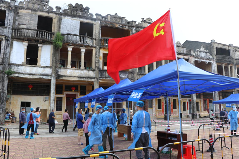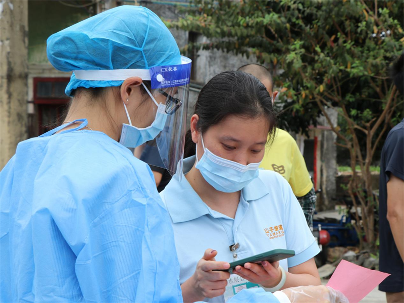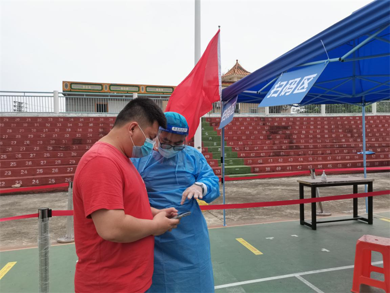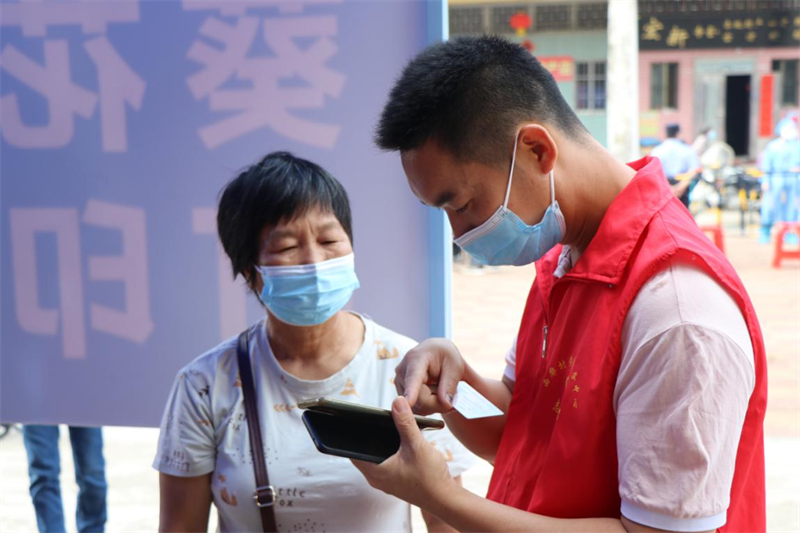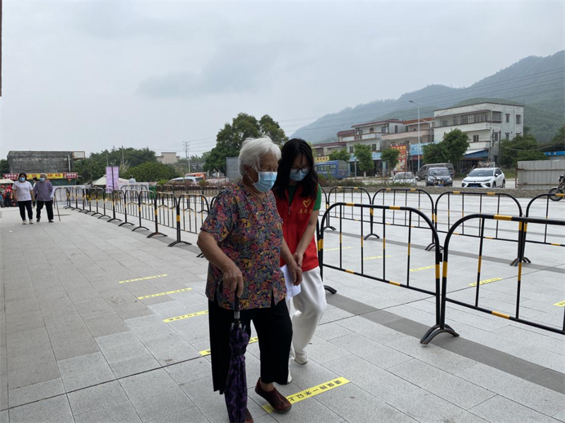 “阿婆,你跟我过来,我带你去绿色通道做检测。”在端芬镇上泽华侨广场检测点,志愿者搀扶行动不便的长者,为其开辟绿色通道并全程陪测。