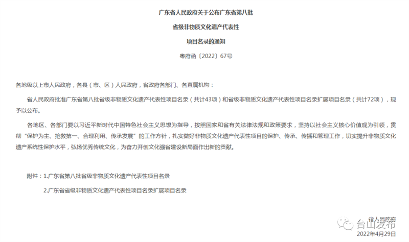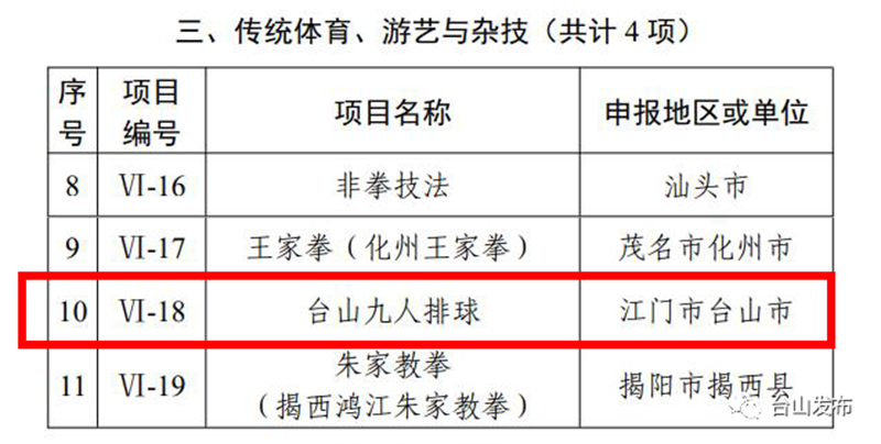 本次省人民政府共批准广东省第八批省级非物质文化遗产代表性项目名录43项,省级非物质文化遗产代表性项目名录扩展项目名录72项。此次我市入选的九人排球项目属于传统体育、游艺与杂技类。到目前为止,我市非遗项目国家级2项,省级3项,江门市级13项,台山市级18项。