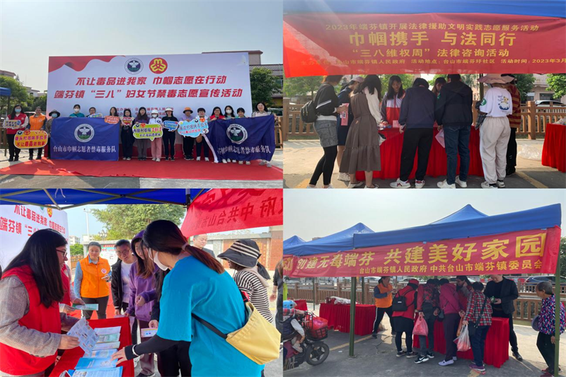 此外,现场还开展了“不让毒品进我家 巾帼志愿在行动”——端芬镇“三八”妇女节禁毒志愿宣传活动和2023年台山市端芬镇“三八维权周”法治宣传教育活动,志愿者通过发放发放宣传单,现场法律咨询,为前来参与活动的妇女群众开展禁毒、反家暴、男女平等、共创文明典范城市、家庭教育促进法等相关知识内容的讲解宣传。