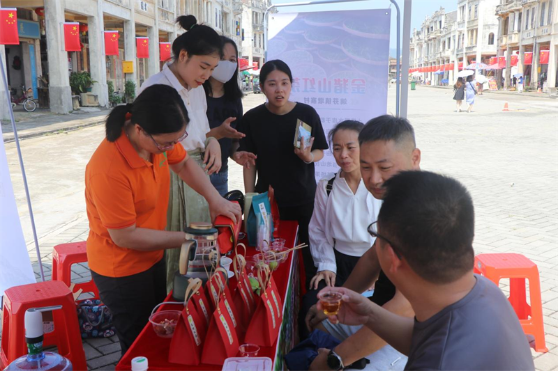 “快来尝尝看,金猪山红茶很好喝的!”“锦江村烤鳗鱼炒饭,美味十足!”公益集市上,选调生一边向游客们展示端芬镇特色产品,一边给他们盖上打卡印章,让大家了解和感受端芬的独特魅力。走近特色产品展示区,美食瓜果,映入眼帘,将一个个游客从“头回客”变成“回头客”。“台山美食,果然名不虚传。”一位游客开心地说道。更是有不少游客现场扫码,当场下单购买特色产品。