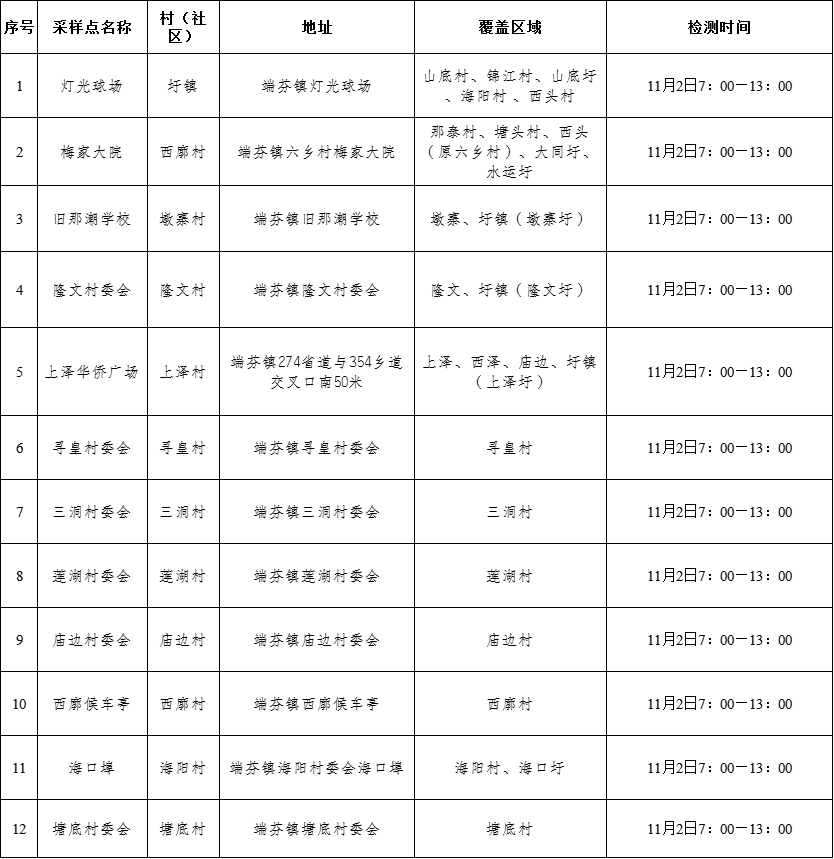 为降低疫情传播风险,保障公共健康安全,及时发现和阻断疫情传播链条,防范疫情输入风险,经市、镇新冠肺炎疫情防控指挥办研究决定,现定于11月2日7时—13时对端芬镇常住人口及临时来端芬人员开展免费核酸检测。现将有关事项通告如下: