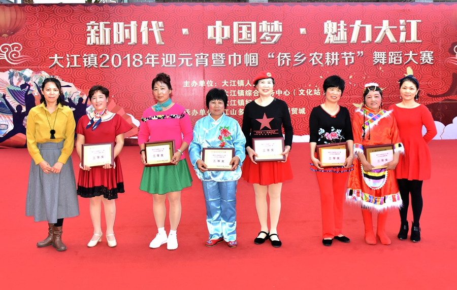 3月1日下午,在大江镇江山多骄—台山•国际文旅展贸城文体广场举行的新时代•中国梦•魅力大江2018年迎元宵暨巾帼“侨乡农耕节”舞蹈大赛圆满闭幕。本次大赛由镇人民政府、镇综合服务中心(文化站)、镇妇联主办,江山多骄国际文旅展贸城承办。