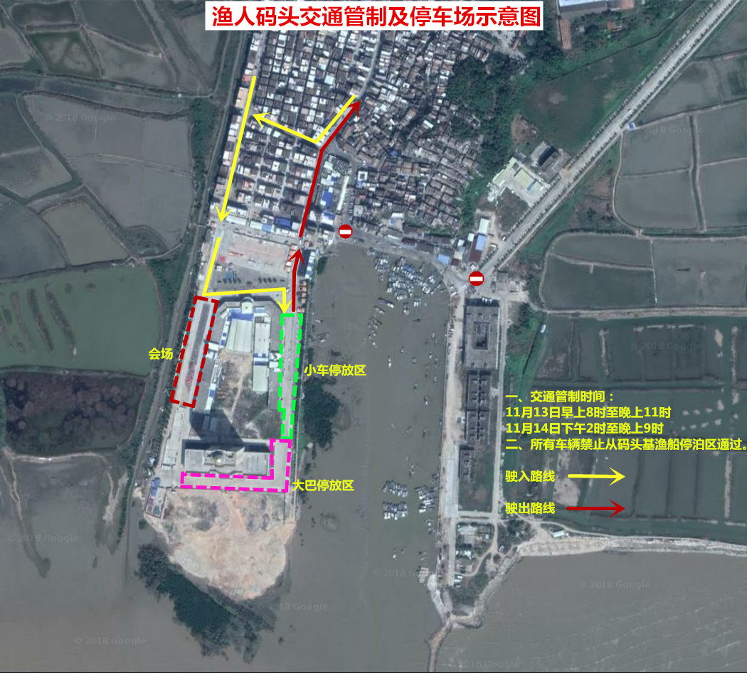 1、11月13日早上8时至晚上11时,11月14日下午2时至晚上9时,所有进入渔人码头的车辆必须从西侧入口驶入(即海傍路与渔人码头交接处),所有离开渔人码头的车辆必须从东侧出口驶出(即渔港大排档前出口)。上述时段内,所有车辆禁止从码头基渔船停泊区通过。