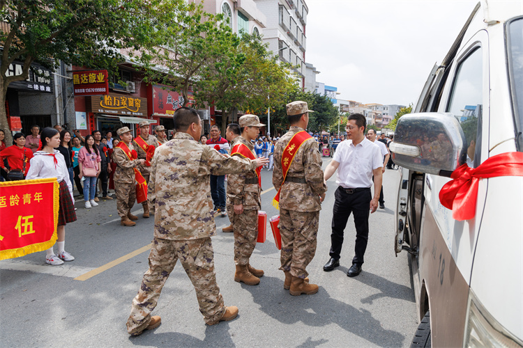 欢送巡游环节将现场气氛推向了高潮。锣鼓队奋力敲响激昂的鼓点,醒狮队随着节奏腾跃舞动,象征着新兵们如雄狮般勇猛坚毅、斗志昂扬。巡游队伍由新兵、领导干部、家属以及各界群众组成,在嘹亮的鼓号声中,沿着主干道徐徐前行。新兵们带着家乡亲人满满的祝福和殷切期望,满怀豪情地迈向军营,开启人生新的篇章。