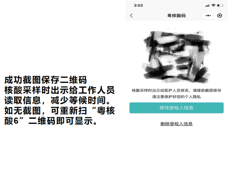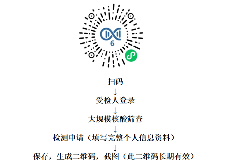 (一)为加快检测速度,请受检人员提前使用微信“扫一扫”粤核酸的葵花码或在微信搜索“粤核酸6”小程序,按照程序指示录入个人信息,生成个人专属二维码并截图保存。