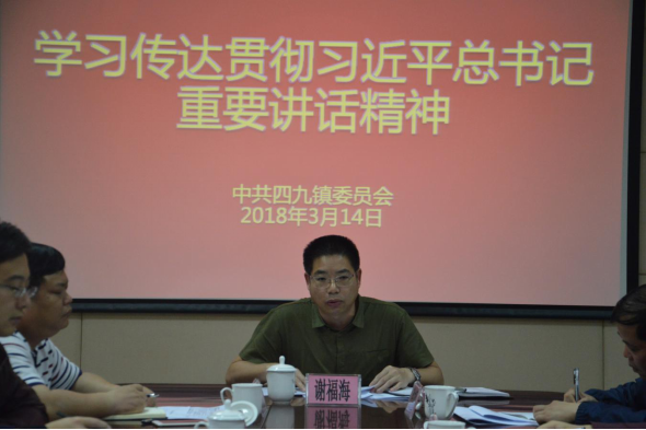 3月14日下午,镇委书记谢福海主持召开四九镇召开党委(扩大)会议,传达学习贯彻习近平总书记在参加十三届全国人大一次会议广东代表团审议时的重要讲话精神以及省委、江门市委、台山市委的部署要求,研究部署我镇的具体贯彻落实措施。
