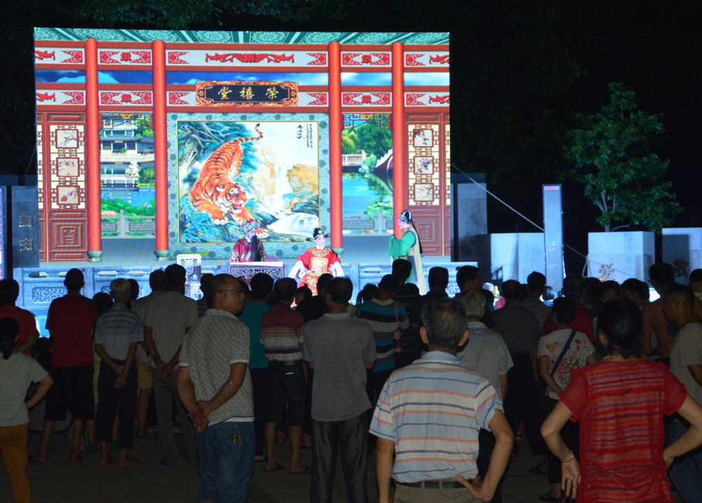 台上粤韵飞扬,台下掌声不断。观众们不顾炎热,认真观看,有的跟着乐韵轻声哼唱,有的打着节拍摇头陶醉,有的拿着手机全程录影。男女老少共聚一堂,一片欢欣祥和的景象。