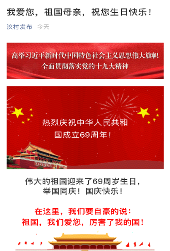今天,祖国母亲迎来了她的69岁华诞。我镇精心制作《我爱您,祖国母亲,祝您生日快乐!》投放到政府微信公众号“汶村发布”,向群众讲述了旧中国被侵略、人民被宰割的屈辱历史,教育群众要珍惜建国以来的幸福生活和来之不易的经济腾飞。同时,为了迎接国庆节的到来,我镇在全镇主干道、人口密集处、墟镇、企业、各村(社区)办公楼等场所悬挂了红旗,营造了良好的社会氛围。