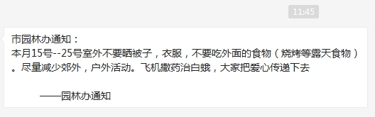 “市园林办通知:本月15号--25号室外不要晒被子、衣服,不要吃外面的食物(烧烤等露天食物)。尽量减少郊外,户外活动。飞机撒药治白蛾,大家把爱心传递下去——园林办通知。”