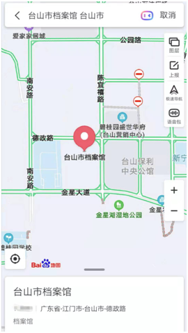 一、百度地图APP导航至“台山市档案馆”(德政路),或高德地图APP导航至“台山市华侨文化博物馆”(东为台山市档案馆)。