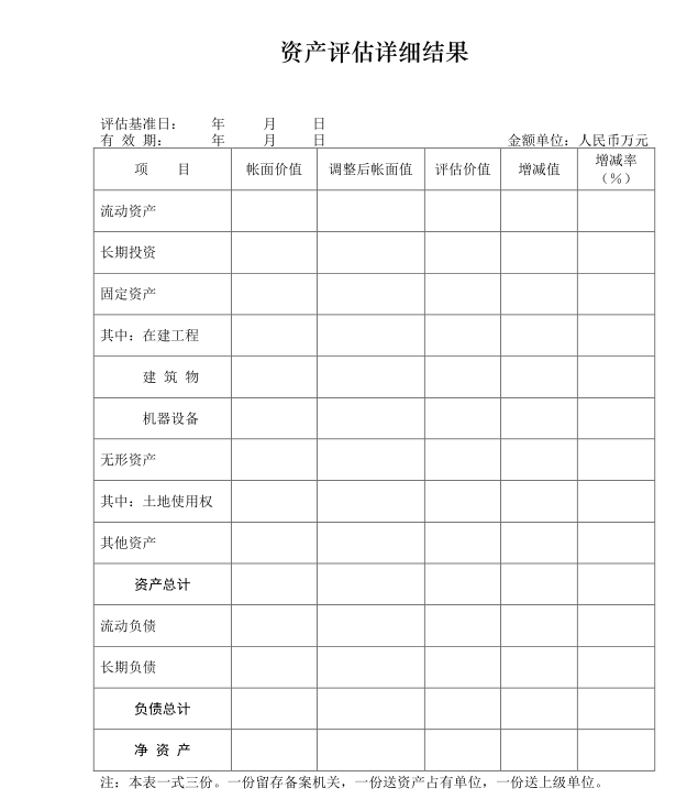 第十一条 申请单位应当委托具有相应资质的评估机构对处置标的进行资产评估,评估结果应当经企业主管部门核准。申请单位提出申请时需报送有关评估资料并填写《资产评估项目核准申请表》、《国有资产评估项目备案表》(各一式三份)。