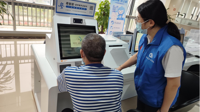 在社保经办大厅网办专区,社保党员志愿者指引群众通过“粤智助”办理社保业务